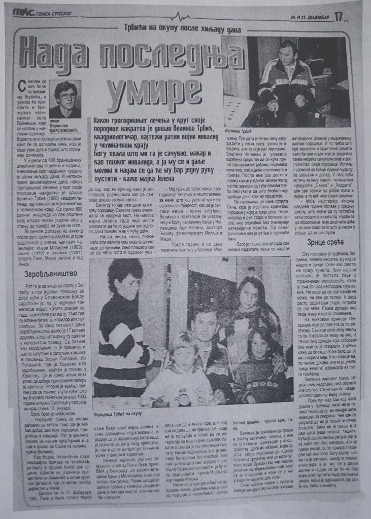 По повратку из заробљеништва, у јануару 1993. године ступа у редове Војске Републике Српске. Као припадник 2. батаљона Челиначке лаке пјешадијске бригаде у 11. фебруара 1995. године на ратишту код Босанске Крупе тешко је рањен у предјелу главе. Након дуготрајног лијечења у Бањалуци и Србији остао је инвалид с највећим процентом инвалидности у Републици Српској (квадриплегичар), те је потпуно непокретан. Ипак, његова храброст, животни оптимизам, ведри дух којим и даље бодри своје ближње, прије свих супругу Гину, кћери Маријану, Јасну и Јелену, унучад и зетове, свједоче о правом људском подвигу.