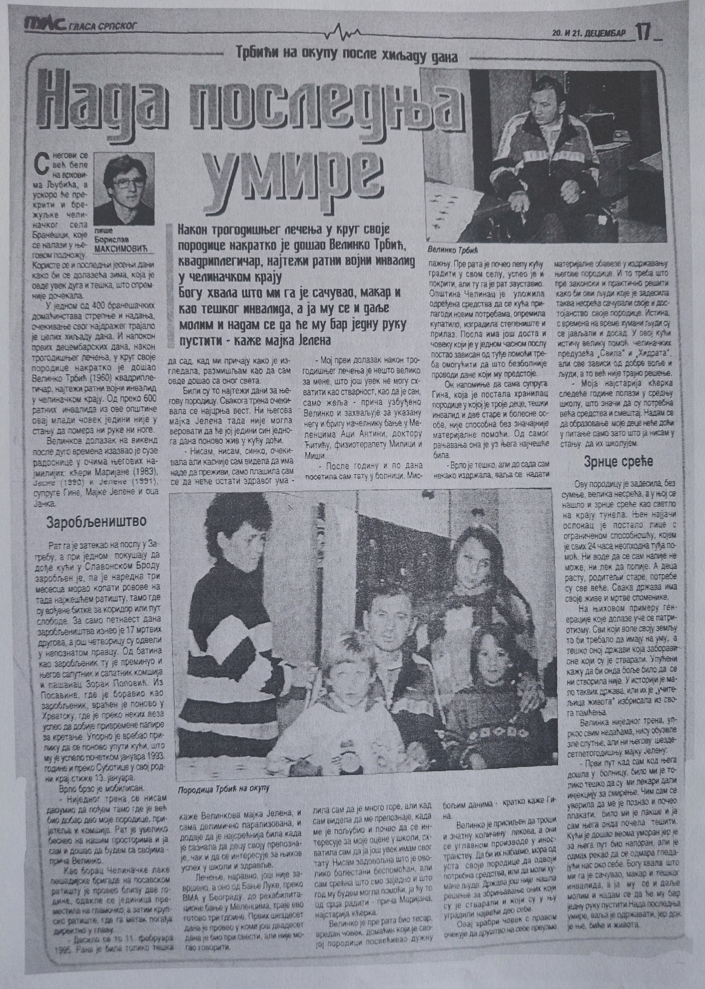 Ратни војни инвалид прве категорије и припадник Војске Републике Српске Велинко Трбић рођен је 1960. године у Бранешцима. Прије избијања ратних сукоба на територији бивше Југославије, био је стално запослен у Хрватској. По повратку у своје родно мјесто бива заробљен на територији Славонског Брода у јуну 1992. године са колегом Зораном Поповићем, такође из Бранешаца. Након заробљавања, одведени су у логор у окупираном Босанском Броду, гдје су заједно са осталим заробљеним Србима били изложени константном физичком малтретирању. Затим је Велинко послије краћег боравка у логору послат на присилни рад копања ровова, док је Зоран Поповић физички исцрпљен остао у логору, гдје је након краћег времена под неразјашњеним околностима убијен.